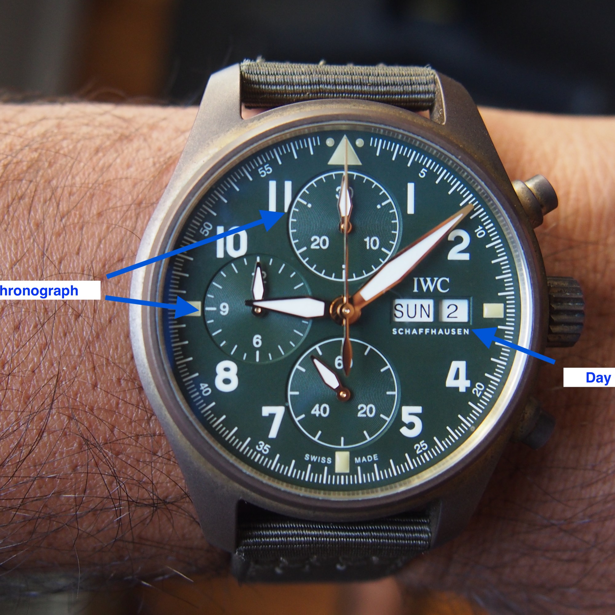 - Chronograph: A chronograph is basically a stop watch with seconds, minutes and hours typically. It’s really not that useful as you don’t often need a timer and when you do a phone is a much better device. I have a chronograph and almost never use it.