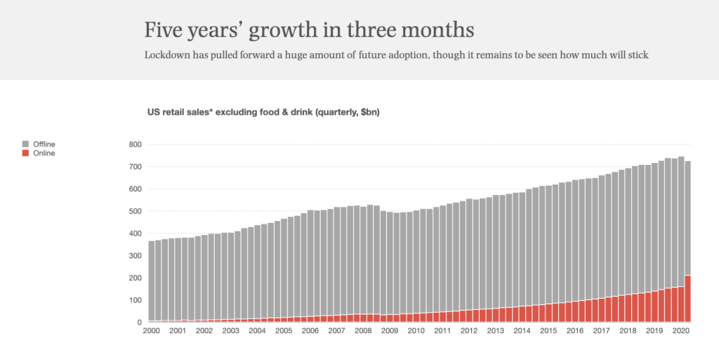 This article from Ben Evans on the growth of eCommerce is a must read. The UK went from 20% to 30% eCommerce penetration and analysts say that Covid has accelerated the growth of eCommerce by 5 years. This is dramatic, and will change the way may of us purchase, discover new products, and how creators distribute their products.