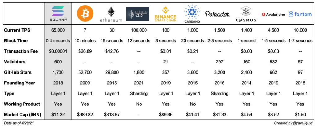 The graphic below is a good summary of the different chains and supports the case that Solana may be technically superior to alternatives. I won’t go into details about the blockchain trilema (decentralization, security, and scalability) in this post but plan to write more about this later.