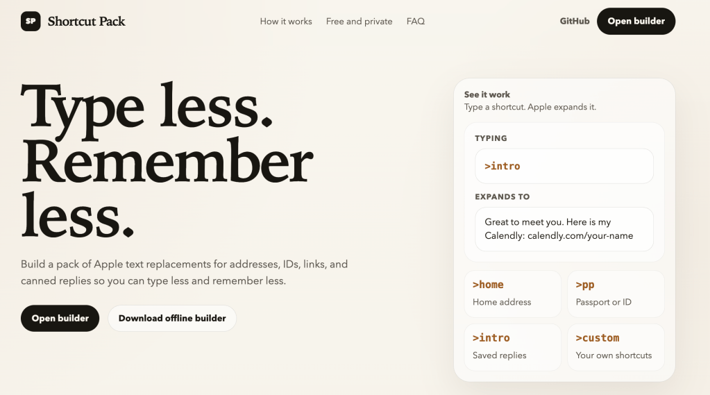 So I built Shortcut Pack, an easy way to set up your text replacements in under five minutes. You configure your pack in the browser, import the generated plist file on your Mac, and iCloud carries it to your other devices. The code is public and the app is free.